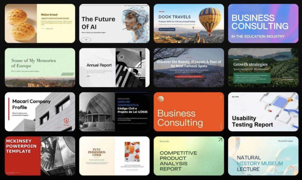 洗練された企業向けピッチデックから、教育現場で使いやすいプレゼンテーションまで幅広くカバーしています。
